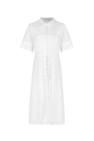 Traditional shirt collar adds structure to the soft silhouette. Short, flared sleeves with scalloped hem and eyelet embroidery, giving a vintage-inspired flair. A-line midi skirt with horizontal embroidered eyelet panels, echoing the sleeve detail and adding a touch of romance. Finished with a delicate scalloped edge, enhancing the feminine mood of the piece. - Lined