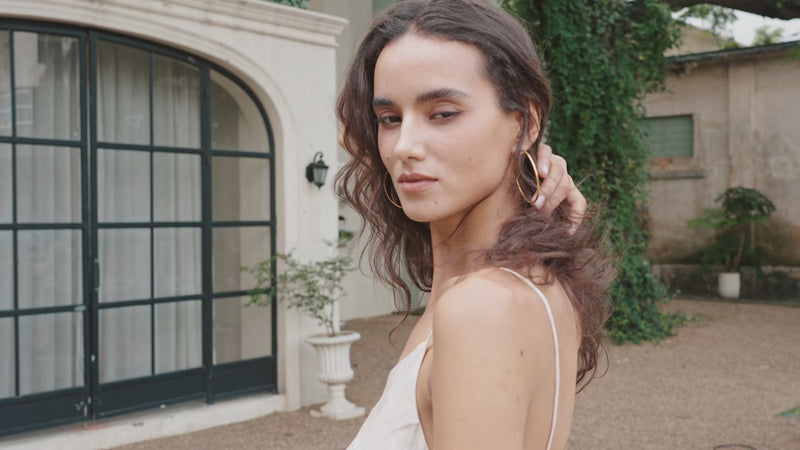 A harmonious blend of silk and linen, combining the natural luster and fluidity of silk with the slightly crisp, breathable structure of linen. A warm ivory or soft champagne, offering a luminous and romantic base. A detailed mirrored floral print cascades from the hem upward in a symmetrical design, featuring blush pink, amber, soft green, and caramel-toned botanicals. The print includes blooming florals, leafy vines, and subtle decorative accents like antique key motifs, all rendered in a painterly, vintage-inspired style. - Lined