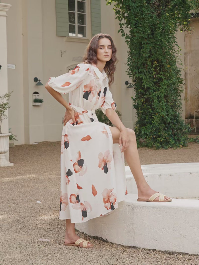 Benjamin dress blends tailored elegance with soft artistic flair, ideal for polished daytime looks or relaxed social gatherings. The base color is a refined ivory or soft cream, adorned with a painterly floral print. The floral pattern is abstract and expressive, giving the dress a contemporary art-inspired edge while remaining romantic. - Lined