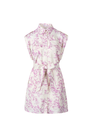Desiree is a sleeveless, shirt-style mini dress crafted from a blend of viscose and linen, giving it a lightweight, breathable, and softly textured feel. The fabric features a delicate, all-over botanical print in soft lilac-purple tones against a creamy off-white background. The floral motif is fine-lined, lending the piece a romantic, airy aesthetic.
