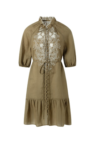 Genevieve linen mini dress is a lovely blend of refined craftsmanship and effortless femininity. Its rich embroidery, soft ruffles, and breathable fabric make it ideal for daytime outings, brunches, garden parties, or even beachside strolls. Pair it with sandals, espadrilles, or woven accessories for a timeless summer look that feels as charming as it is comfortable. - Lined