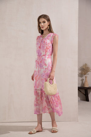 Embrace sheer elegance in this Lorelle silk long dress, a symphony of grace and allure. Crafted from luxurious silk, it drapes fluidly, caressing the skin with opulence. The vibrant floral print dances across the fabric, a canvas of nature's splendour. The self-tie belt delicately cinches the waist, defining a silhouette of refined sophistication. Effortlessly chic, it exudes timeless charm and ethereal movement, making every step a graceful enchantment. - Lined