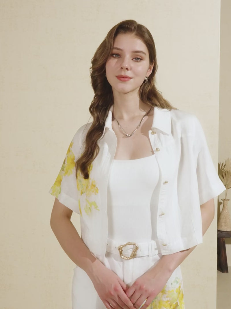 These are elegant wide-leg trousers made from a viscose and linen blend, combining breathability with a refined, softly structured drape. The base color is a pure ivory white, which provides a luminous and polished backdrop. The design resembles watercolor brushstrokes, lending the trousers an artistic, summery, and organic feel.