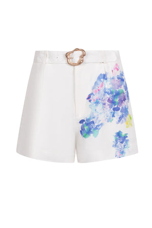 These are elegant tailored shorts crafted from a lightweight blend of viscose and linen, offering a breathable yet structured silhouette. The base is a clean ivory white, serving as a fresh backdrop for the painterly floral design. The print feels artistic and natural, as though hand-painted onto the fabric, lending a summery, garden-inspired touch. - Lined